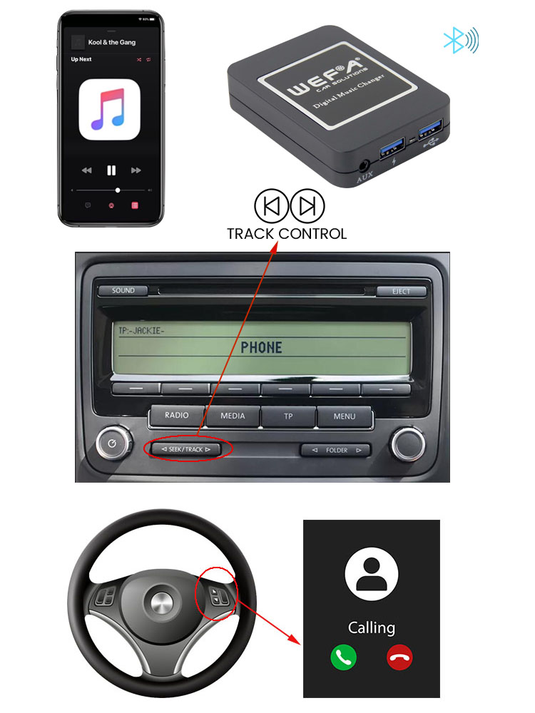 - Hands-free calling (HFP). Control is via your original car radio or steering wheel buttons (AVRCP).